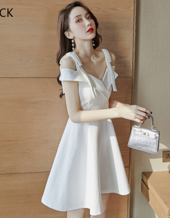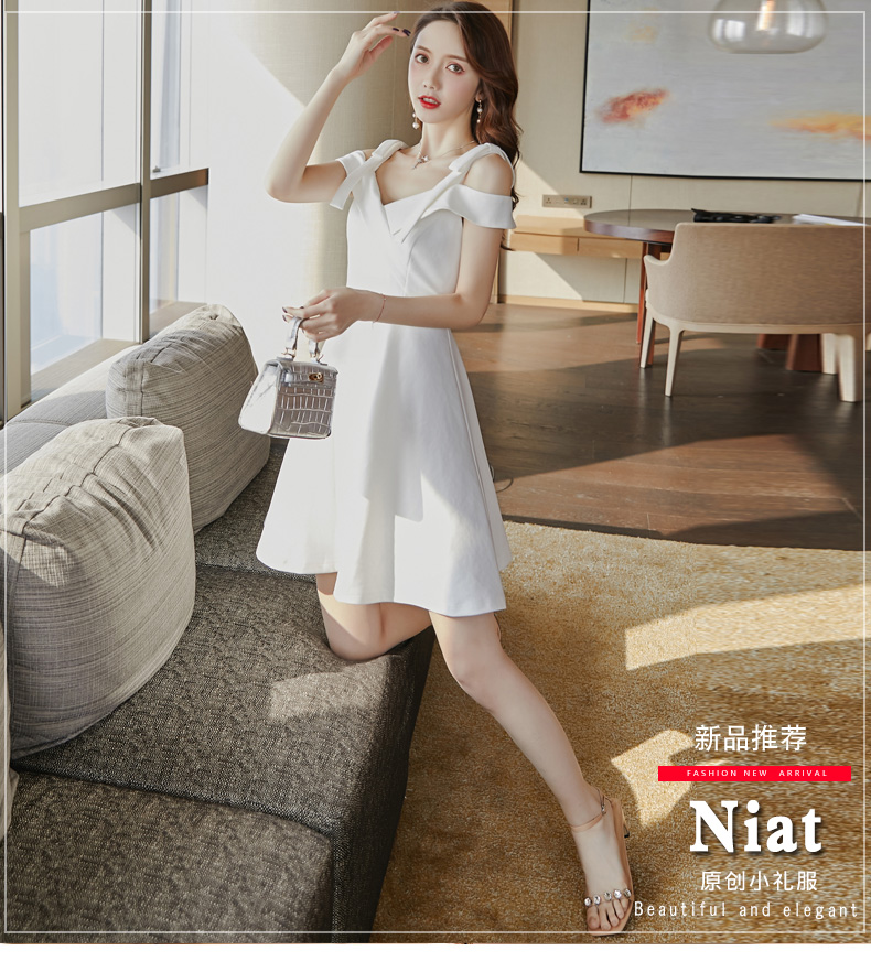 KM CK 宴会气质平时可穿显瘦吊带一字肩连衣裙白色小晚礼服裙