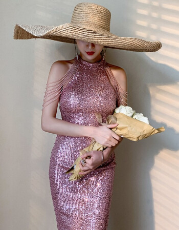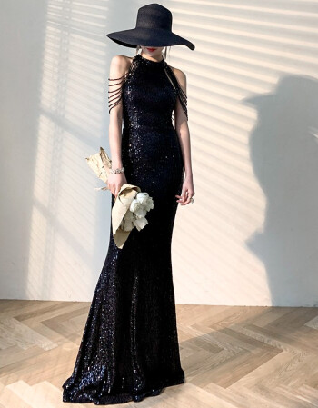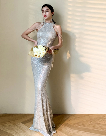 > 雪宝莲2020新款修身鱼尾挂脖性感肩流苏晚礼服